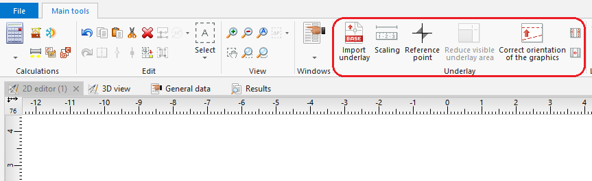 - Икони на елементи и функции, свързани с импортирането на подложка, се намират в прозореца "2D редактор" в прозореца на лента с интрументи Главни ленти с инструменти, секция Основа, когато Основа е разрешен обхватът за редактиране.