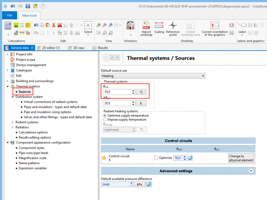 - Раздел - Термални системи / Източници – проверява параметри: Използване на източник подразбиране и захранваща температура (θs,О).