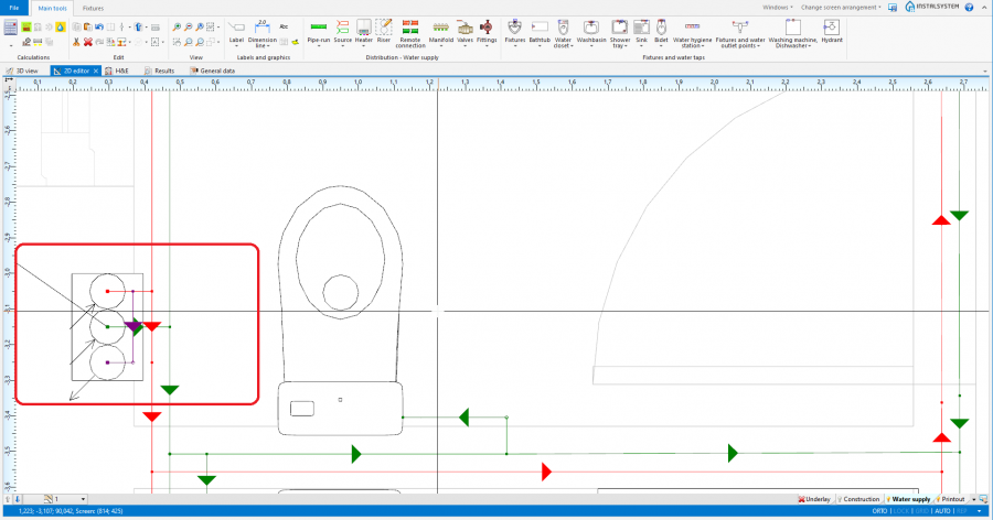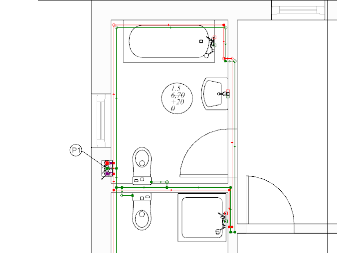 - Draw hot and cold water pipe feeds, so that a loop installation is created in room 1.5.