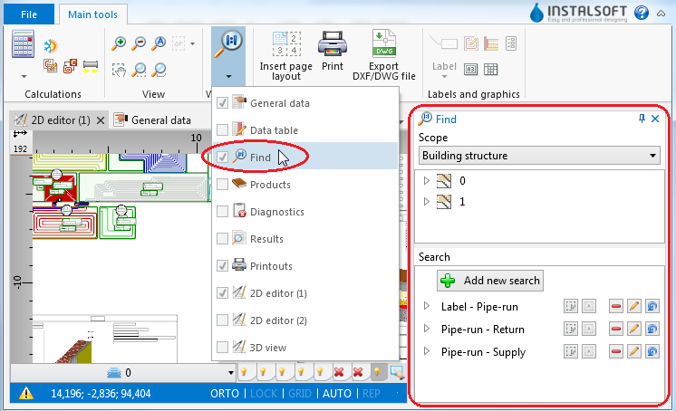 Инструментът позволява търсене на елемент или група елементи в рамките на проекта. В резултат намерените елементи са маркирани във всички активни прозорци, като например: 2D редактор, 3D изглед, Таблица с данни, Резултати и т.н.
